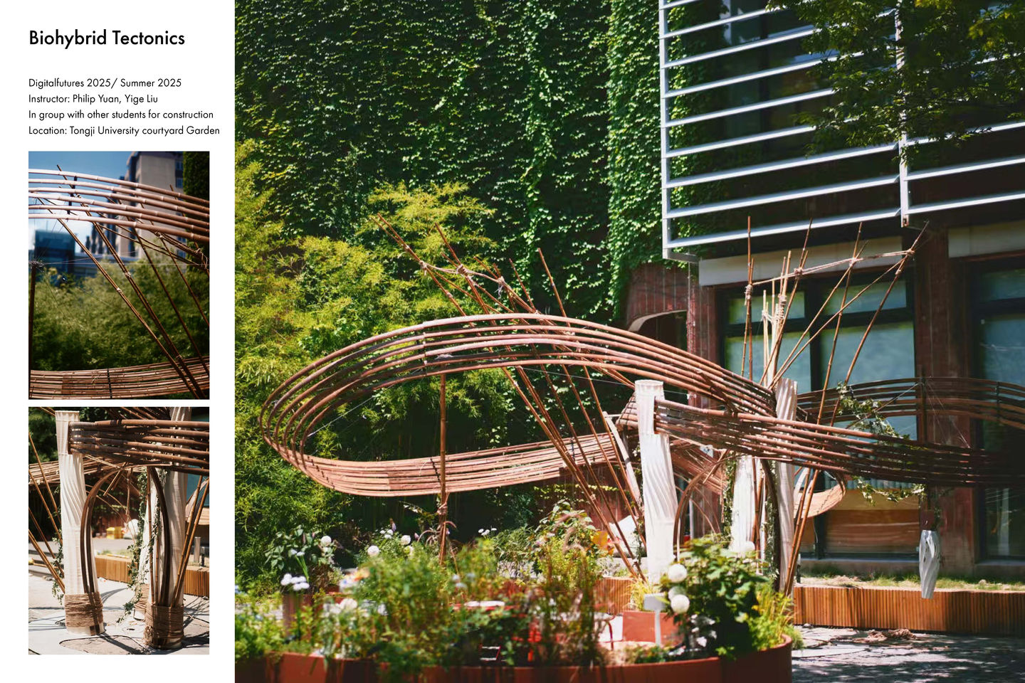 This project focuses on the robotic assembly process and design of wooden structures, including a cat bench and architectural forms in a lush garden setting.